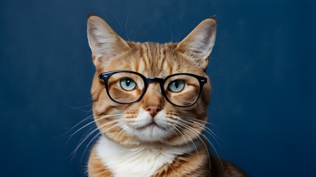 A confident orange tabby cat with striking blue eyes wears stylish black glasses, showcasing a playful personality against a deep blue backdrop that enhances its charm.. generated