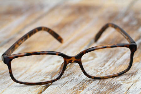 Reading glasses on rustic wooden surface