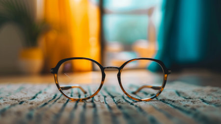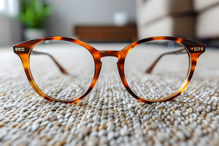 Close-up of stylish tortoise shell eyeglasses placed on a textured carpet in a contemporary living room. the blurred background features a green potted plant and beige furniture, a cozy and sophisticated home interior. Generative AI