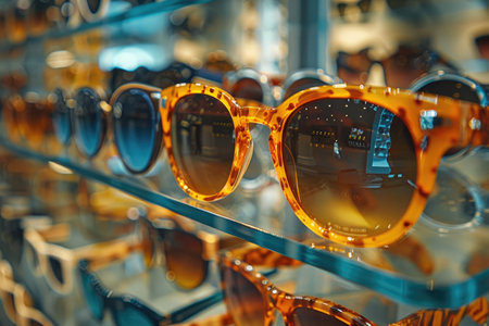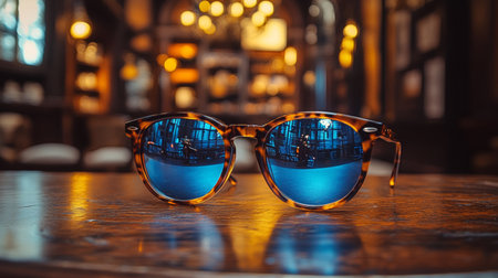 A pair of stylish blue sunglasses placed on a reflective surface, capturing warm ambient lighting in an elegant scene.
