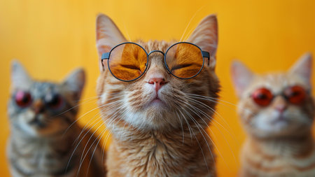 Fluffy cat wearing yellow glasses, posing against a yellow background, highlighting its playful and stylish look. High quality photo