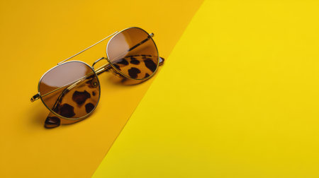 Stylish brown sunglasses on yellow background with copy space.