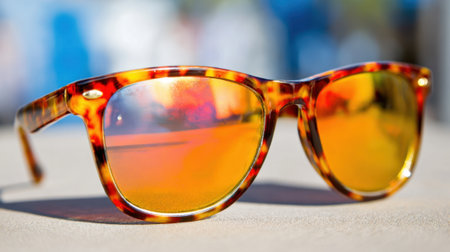 Brightly colored sunglasses rest on a sandy surface reflecting vibrant hues in the sun.