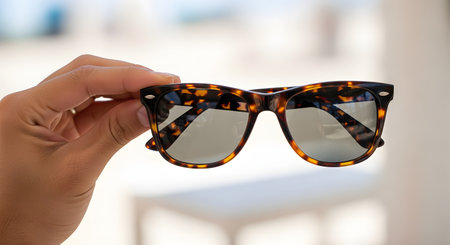 A person's hand holds up a pair of classic, stylish sunglasses with a brown tortoiseshell frame. The background is brightly lit and blurred, suggesting an outdoor or beach setting.