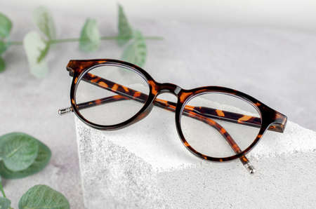 Stylish glasses on a podium made of natural stone. Leopard-colored glasses and plants on a concrete background