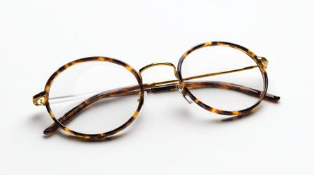 Elegant tortoiseshell eyeglasses with gold accents and clear lenses on white background. Classic round frame design for vision correction and fashionable eyewear.
