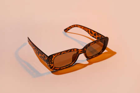 Glasses for vision. Stylish women's glasses of leopard color on a figured light background. Women's accessories.