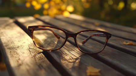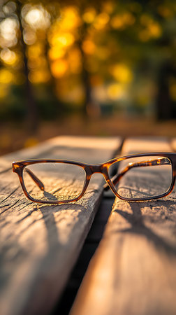 The focus lies on eyeglasses placed upon a weathered wood table bathed in warm light; beyond, an artistic blur of autumn trees offers a soft, vibrant backdrop.
