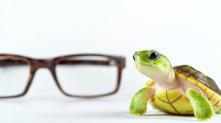 A small turtle leans close to a pair of glasses, embodied curiosity and fun.