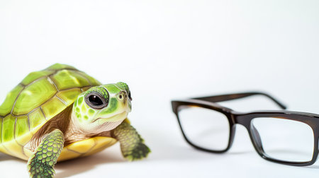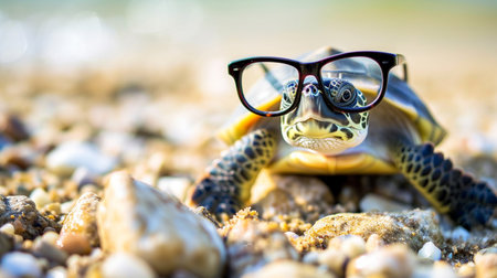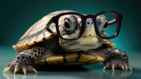Adorable turtle with glasses, posed against a softfocus background, cute and quirky