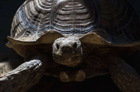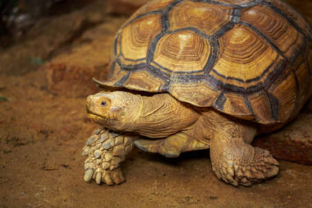 Turtle (Centrochelys sulcata) on concrete. cute pet turtle. animal care and treatment concept