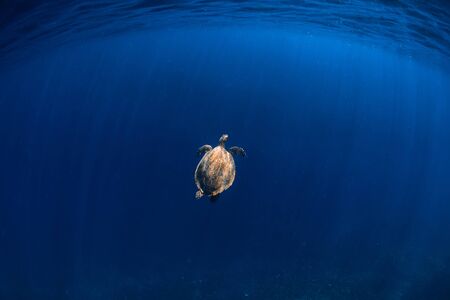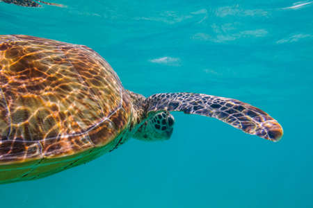Little sea turtle diving in clear shallow water. Turtle in natural environment. Tropical seashore wildlife.