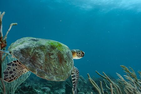 A beautiful green sea turtle glides over a Caribbean reef in Grenada, West Indies.