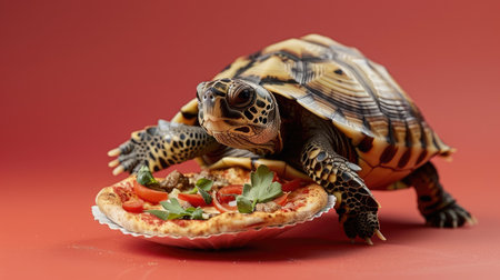 Turtle Enjoying Pizza on a Vibrant Red Background - Quirky Animal Photography