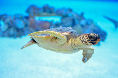 Turtle in the reserve. White sea turtle swimming in clear water.