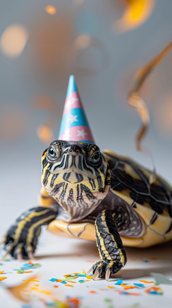 A small turtle in a party hat sits on a confetti-covered table, looking curious. The colorful image is ideal for celebrations, adding a festive touch to any setting.