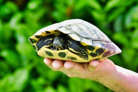 turtle on hand close up. The concept of human friendship with the animal world. Helping needy animals
