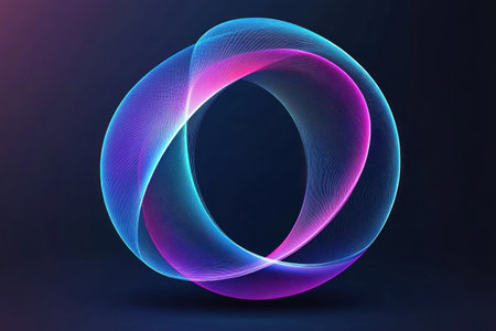 Abstract vector background with blue and purple lines forming a circular shape on a dark black background, perfect for technology or digital marketing design projects. The composition of the illustration is simple yet visually appealing, featuring an elegant circle with a colorful glow effect that adds depth to its appearance. This dynamic element could be used in various creative designs as a symbol representing modernity and innovation. Isolated on a pastel background. --ar 3:2 --v 6.1 Job ID: 8fb8d9a3-9f32-45ff-aa31-07712e1db6f0