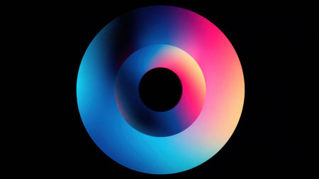 Vivid concentric circles in shades of blue, pink, and orange create an engaging visual effect against a dark background, showing modern design aesthetics.