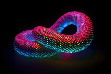 A stunning neon torus shape radiates vibrant colors against an abstract digital background, showcasing a fusion of technology and art. Perfect for creative projects.