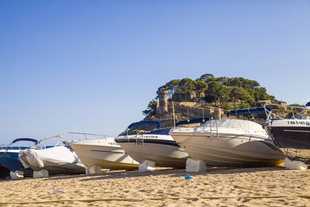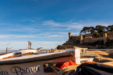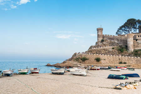 Beach under the castle in Tossa de Mar. Boats on the seafront near the walls of the old city. The historic city and the castle tower of La Vila Vella. A beautiful Catalan town on the Costa Brava