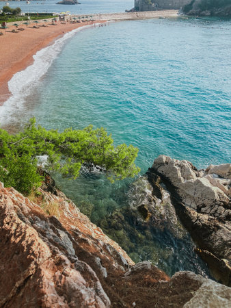 view from a cliff to the Adriatic sea with waves in Montenegro with the Sveti Stefan and mountains