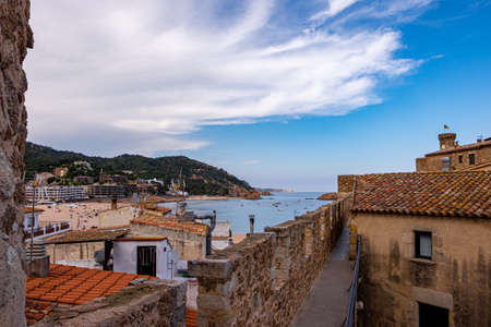 View of the city of Tossa de Mar from the castle hill. Fragments of the defensive walls of the old town of La Vila Vella. Architecture and buildings of the Catalan city on the Costa Brava.