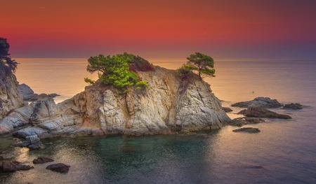 Sea landscape at sunrise. Beautiful view of cliff in Mediterranean at dawn in morning. Bright red sky over Spanish coast of Lloret de Mar, Costa Brava, Spain. Amazing nature and coastline with rocks