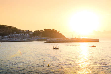 The Spanish city of Tossa de Mar located in Costa Brava is a coastal region of Catalonia. Beautiful sunset sky, an ancient cliff fort, sandy beach and the Mediterranean Sea.