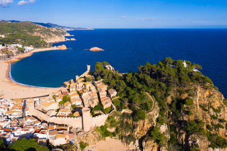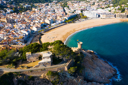 The Spanish city of Tossa de Mar located in Costa Brava is a coastal region of Catalonia. Aerial view. Old city, sea, cloudy sky.