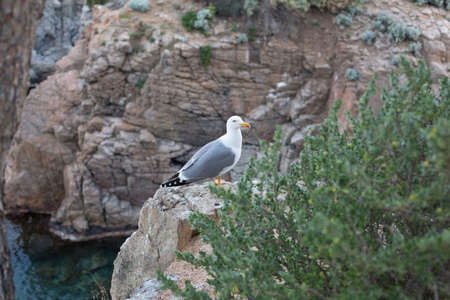 Adult seagull resting very close to a cliff in the Mediterranean Sea.