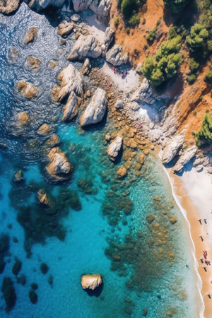 A body of water, framed by an array of rocks and stones, creates a rugged and striking landscape, Panoramic top view of the cerulean sea brushing against uneven rocks, AI Generated