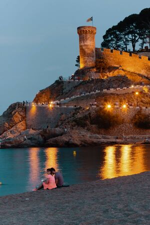 TOSSA DE MAR,SPAIN - AUGUST 4, 2019: Unknown guy and girl couple sit late in the evening on the seashore near an ancient fortress.