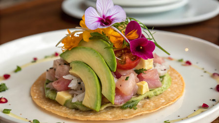 A close-up shot of delicious Mexican tacos with fresh vegetables, including tomatoes, peppers, and vibrant edible flowers, on a wooden table. The dish is arranged artfully with a focus on the colorful ingredients.