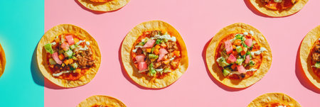 Colorful street food items, including tacos and pizza, are neatly arranged in geometric patterns on vibrant backgrounds at a market.