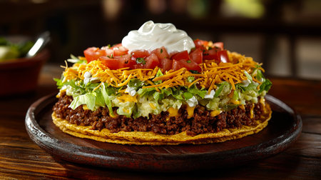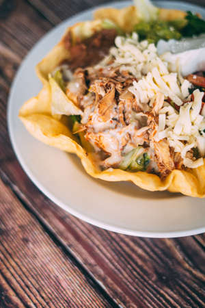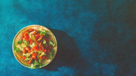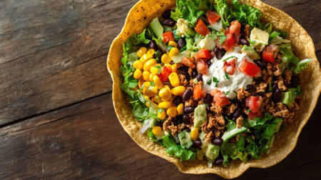 Top view of a crispy taco salad in a tortilla bowl with various toppings, with room for text. --ar 16:9 --v 6.1 Job ID: 16e30800-0093-4425-b682-517aa846926c