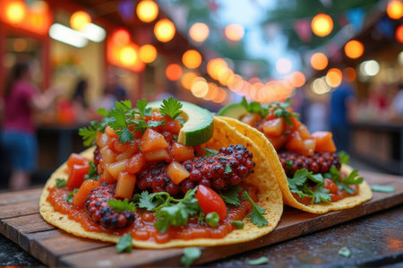 Vibrant octopus tacos with salsa and lime at outdoor market. That the image is generated using AI.