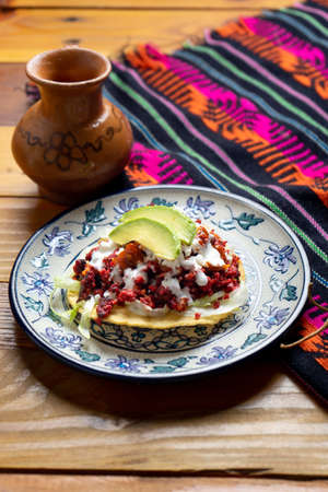 Tostada of corn, typical mexican food. Tostadas on a plate on a wooden table.