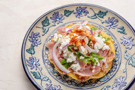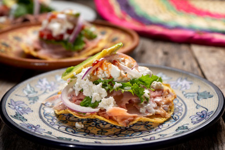 Traditional mexican tortilla toast with chorizo also called tostadas