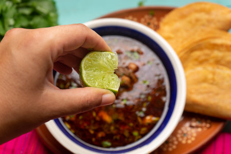Traditional mexican birria consome soup and tacos on turquoise background