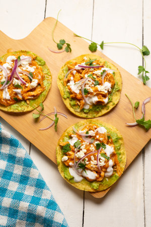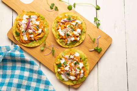 Chicken tinga tostadas with cheese and avocado. Traditional mexican food