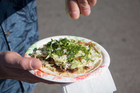 Lime being squeezed onto a taco