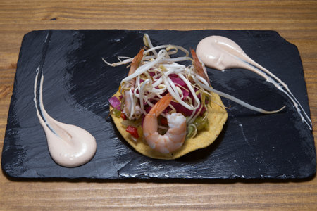 Tostadas de camaron Mexicanas, shrimps mexican food in mexico, sea foods