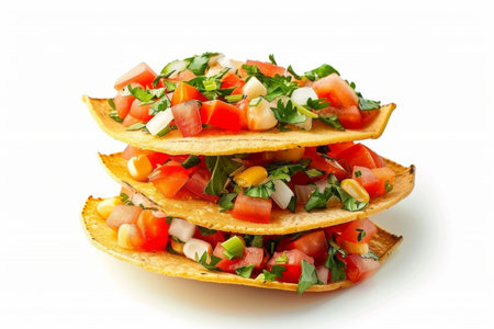 A vibrant stack of tacos, loaded with fresh tomatoes, cheese, and green onions, showcases the beauty of Mexican cuisine.