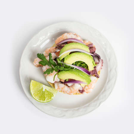 Traditional mexican tuna salad toast also called tostada on white background