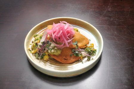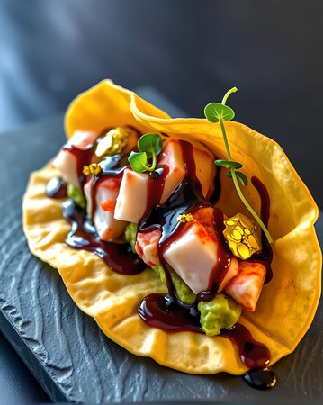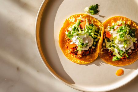 A vibrant taco plate featuring fresh ingredients like avocado, tomato, corn, and garnished with salsa, perfect for showcasing culinary creativity and healthy eating.