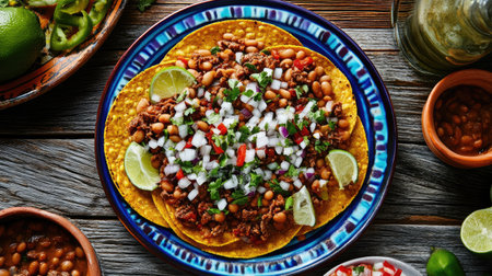 Vibrant mexican fiesta: fresh tostadas with beans and cilantro at outdoor celebration. That the image is generated using AI.