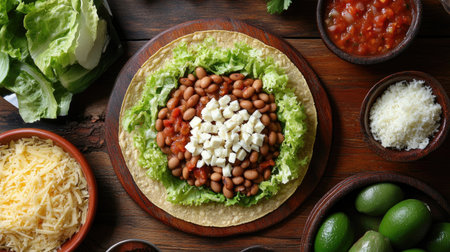 Top view of a fresh Mexican tostada with beans, lettuce, cheese, and salsa, arranged on a rustic table.