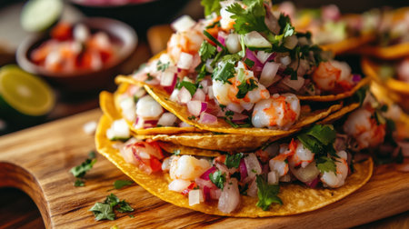 A pile of ceviche tostadas topped with fresh seafood, cilantro, and onions sits on a wooden cutting board, ready to serve.