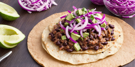 Mexican tacos with black beans, avocado, onion and red cabbage